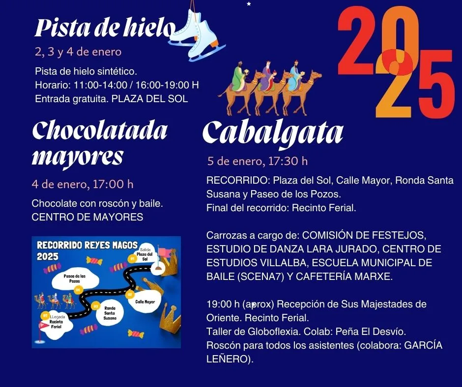 • A las 17:30 h, comienza la gran Cabalgata de Reyes con cinco carrozas espectaculares y, al finalizar, recepción real con los Reyes Magos y Roscón Gigante en el Recinto Ferial.