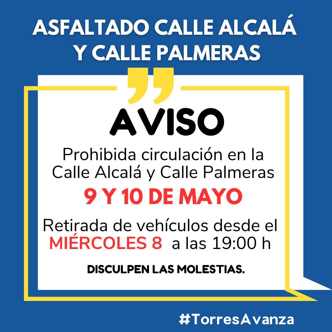 El jueves 9 y el viernes 10 de mayo se va a proceder al asfaltado de la Calle Alcalá y Calle Palmeras.