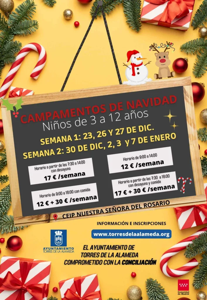 Los días no lectivos de Navidad pueden resultar un problema para aquellas familias cuyos progenitores tengan que trabajar. El servicio de conciliación del Ayuntamiento de Torres ofrece campamentos lúdicos para estos días en el CEIP Nuestra Señora del Rosario desde las 07:00 hasta las 16:00 h para niños entre 3 y 12 años.