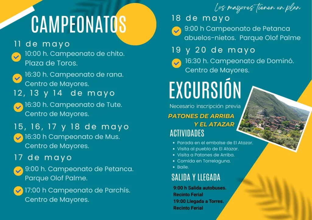 • 17 de mayo:  9:00 h. Campeonato de Petanca. Parque Olof Palme // 17:00 h Campeonato de Parchís. Centro de Mayores.