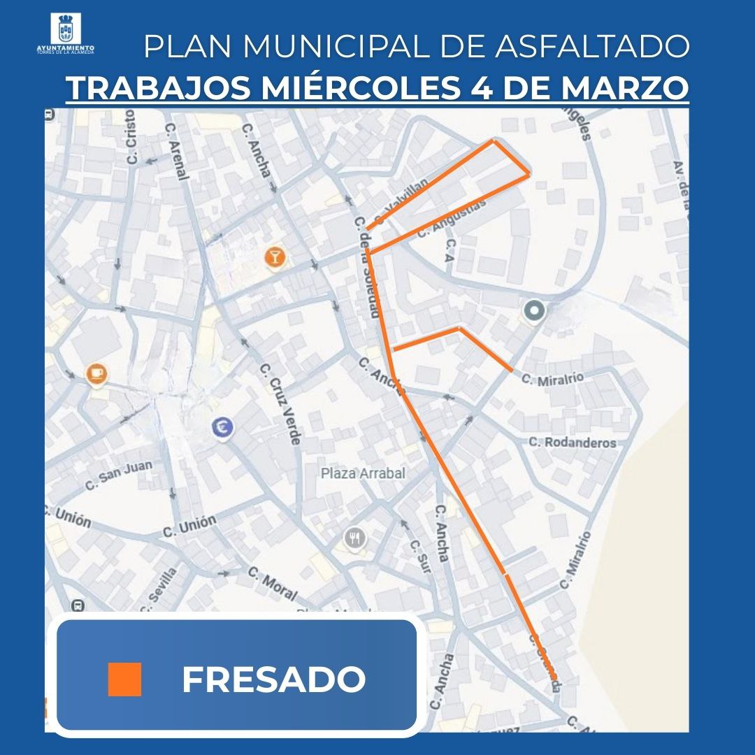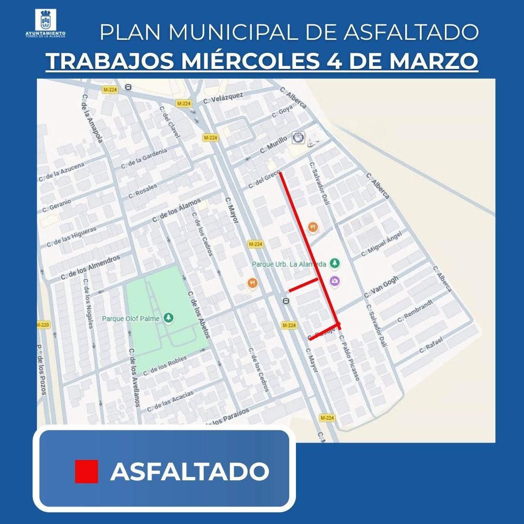Mañana miércoles continúan los trabajos incluidos en el Plan Municipal de Asfaltado, con actuaciones de fresado y asfaltado en distintos puntos del municipio.