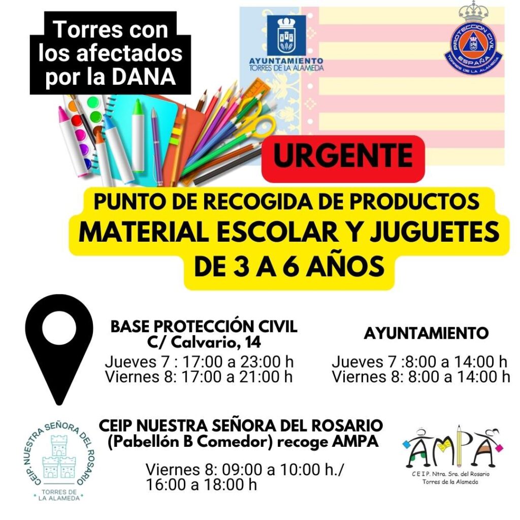 Durante el jueves y el viernes recogeremos todo tipo de material escolar por la mañana en el Ayuntamiento (8:00-14:00 h) y en la base de Protección Civil (jueves de 17:00 a 23:00 y viernes de 17:00 a 21:00 h)