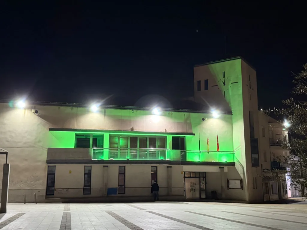 Hoy, 4 de febrero, la fachada del Ayuntamiento se ilumina de verde en conmemoración del Día Mundial contra el Cáncer.